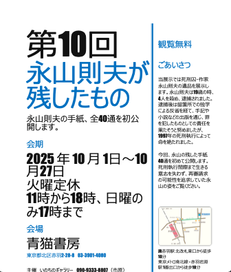 永山則夫が事件を起こした10月から11月にかけて毎年「永山則夫がのこしたものin青猫書房」と名付けて展示会を開催しています。