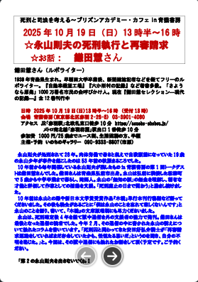 1 最初が10月1日、4週間の展示startです。テーマ「永山則夫の再審請求」。火曜日定休。観覧無料。2 10月19日は鎌田慧さんのお話。テーマ「永山則夫の死刑執行と再審請求」。